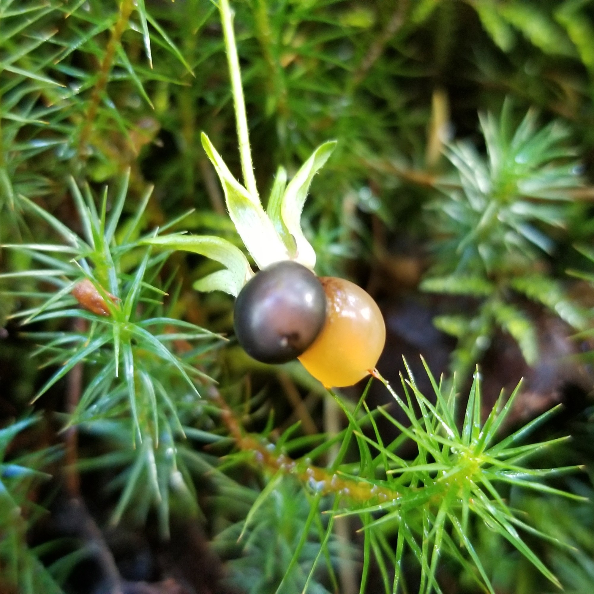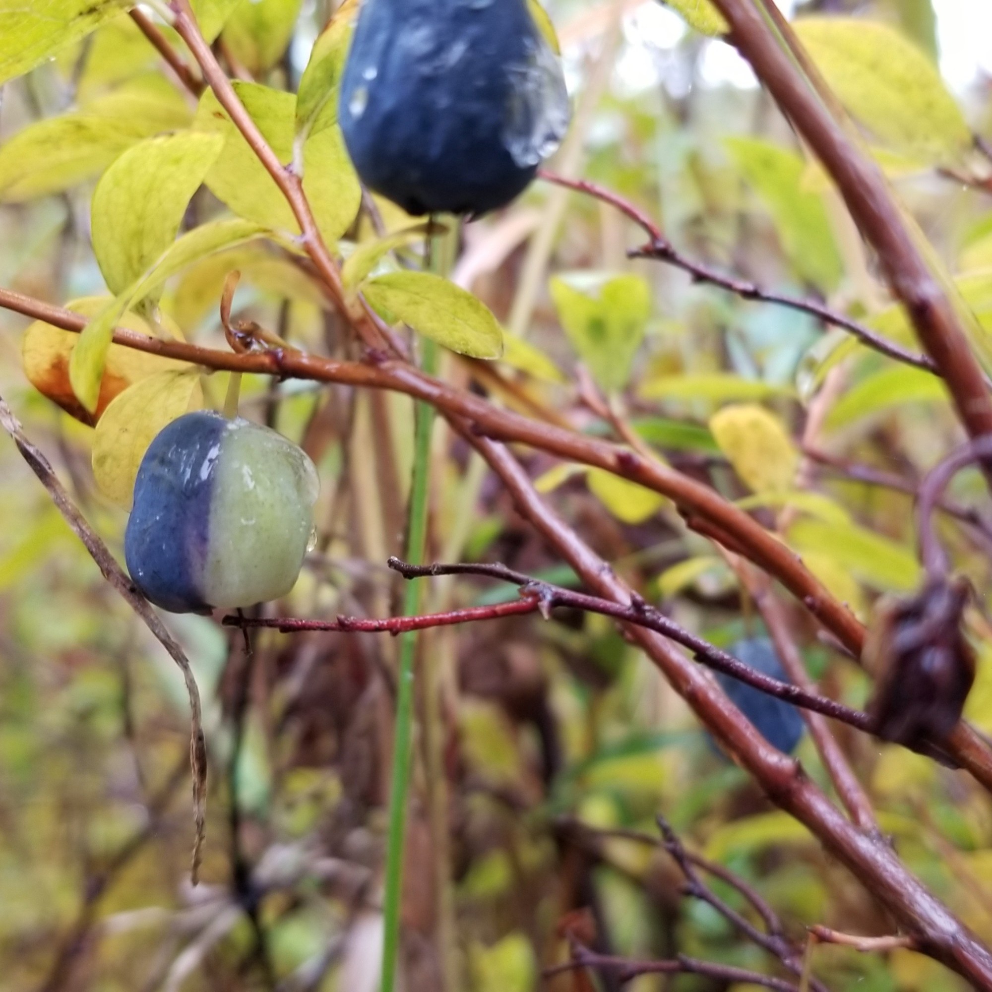 Interesting color variations or odd looking berries growing among their typical fellows. Left image is a trailing raspberry growing with the usual red ones. Middle image is a bog blueberry with exactly half the berry ripened. Right image is the newly discovered ‘woodfrogberry’!