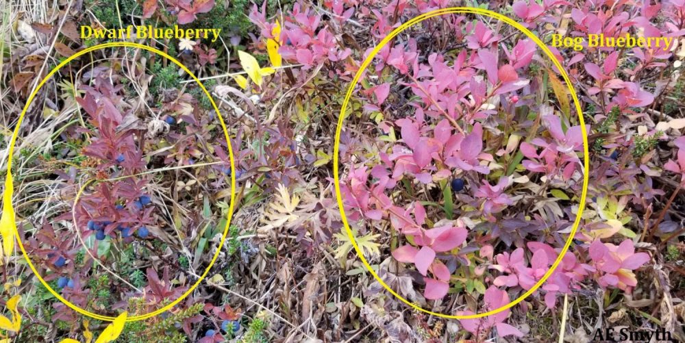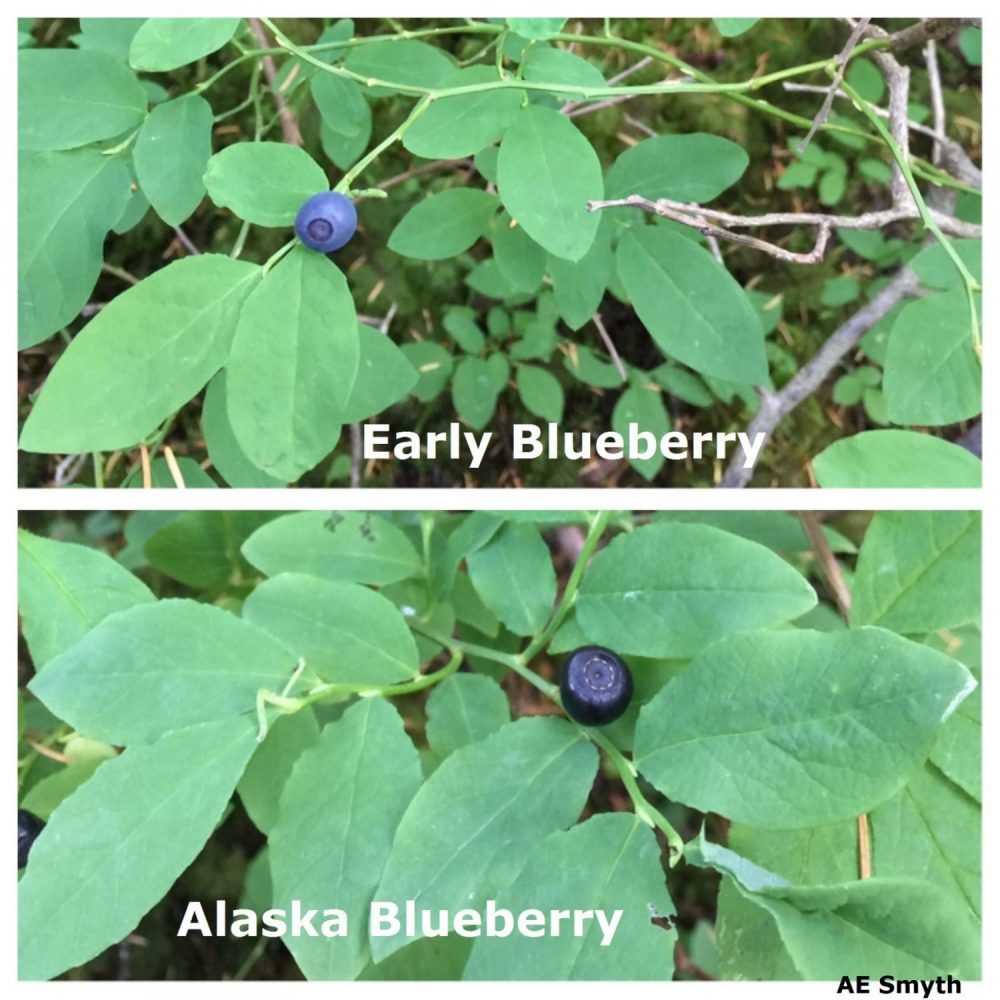 Here is a comparison of blueberry species growing near each other in subalpine areas. Left image is Early Blueberry with Alaska Blueberry in August (Alyeska). Right image is Dwarf Blueberry with Bog Blueberry in September (Hatcher Pass).