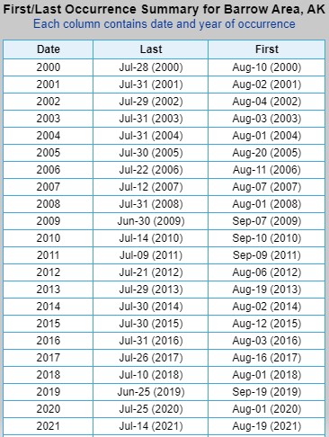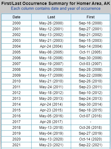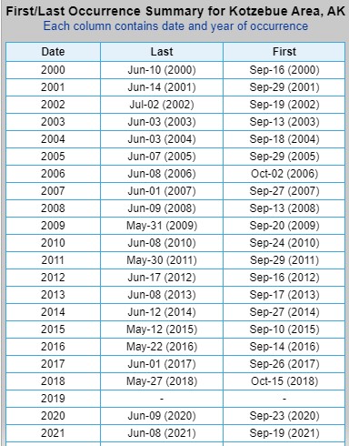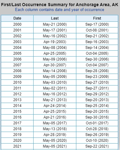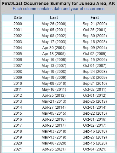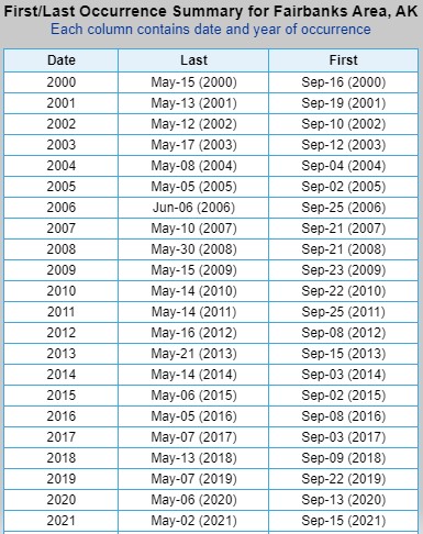 First and Last Freeze dates collected directly from the NWS Climate Information webpage. Areas I’ve searched are Utqiaġvik, Kotzebue, Fairbanks, Bethel, Talkeetna, Anchorage, Homer, and Juneau, but many more areas are searchable.