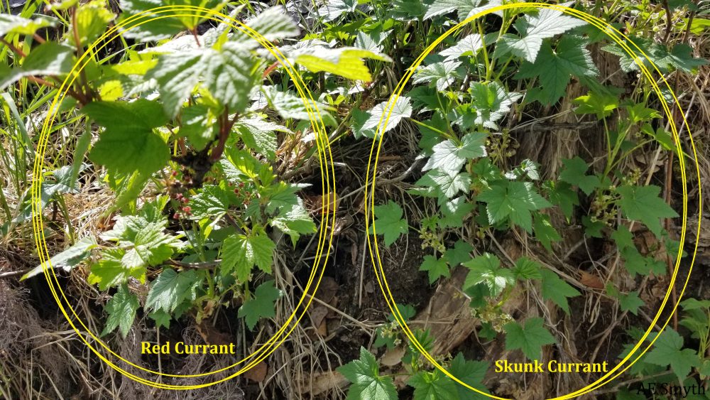 Red Currant and Skunk Currant flowering together in a swamp area in May (Big Lake).